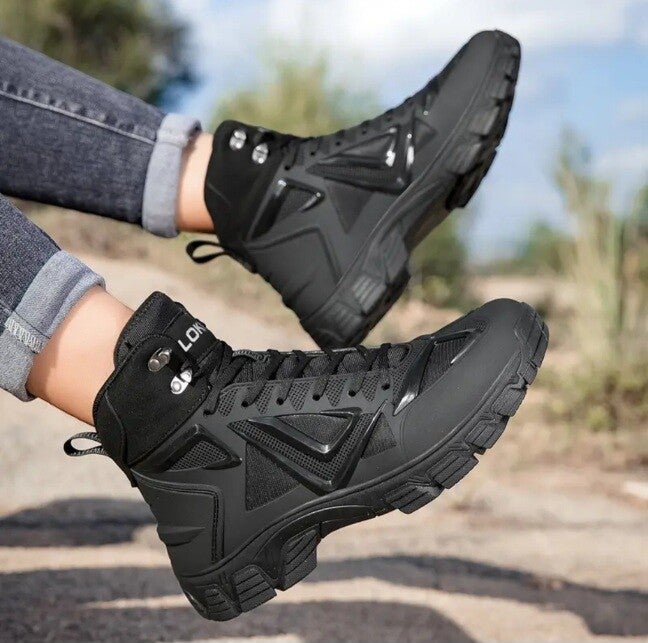 Robuuste Constructie & Duurzaamheid: Het bovenwerk combineert duurzame synthetische materialen met verstevigde, driehoekige panelen voor maximale stabiliteit en bescherming tegen stoten. Ideaal voor zware omstandigheden.