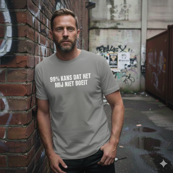 De opvallende tekst "99% KANS DAT HET MIJ NIET BOEIT" is in een helder wit lettertype gedrukt, wat zorgt voor een scherp contrast met de diverse kleuropties. Verkrijgbaar in een reeks veelzijdige kleuren, waaronder klassiek zwart, levendig rood, diep koningsblauw, neutraal sportief grijs en stoer olijfgroen, is er altijd een tint die bij jouw persoonlijke stijl past. Het ontwerp is tijdloos met een ronde hals en korte mouwen, ideaal voor casual gelegenheden, een avondje uit of gewoon om je houding te uiten. De hoogwaardige print is duurzaam en bestand tegen veelvuldig wassen, zodat je boodschap keer op keer duidelijk overkomt. Dit T-shirt is niet zomaar een kledingstuk; het is een uiting van zelfvertrouwen en een vleugje humor.